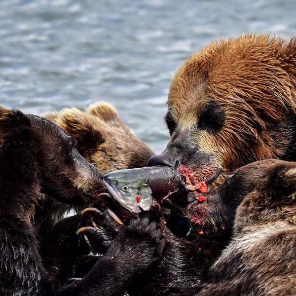 TASS - მდედრი მურა დათვი თავის ბელებთან ერთად კამჩატკაზე მდებარზე კრონოცკოეს ტბაში თევზს შეექცევა.