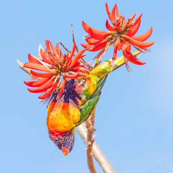 Alamy - ავსტრალიური ფერადი ლორიკეტი (Trichoglossus haematodus) მარჯნის ხის იგივე ერითრინას ყვავილზე თავდაყირა ზის.