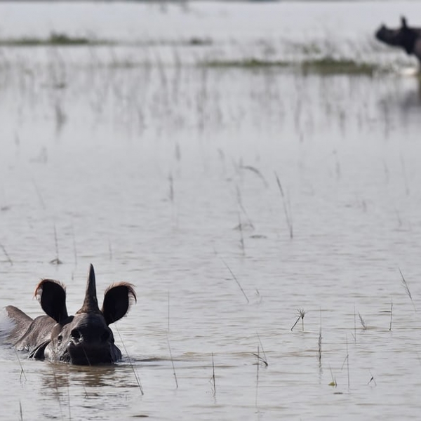 ბიჯუ ბორო - ინდური მარტორქები წყალდიდობისას პობიტორას ნაკრძალში.