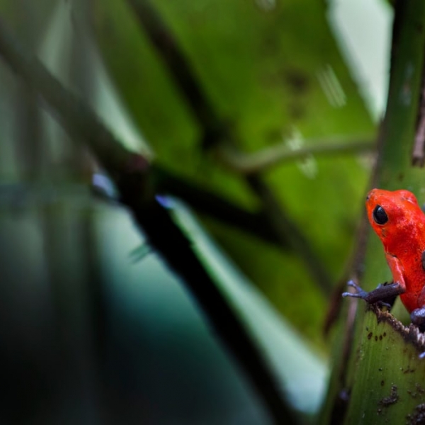 რობერტო გარსია-როა - ბაყაყ შხამიან ისარს (Oophaga pumilio) ორქიდეის ძიებაში თავკომბალა ზურგით გადაჰყავს.