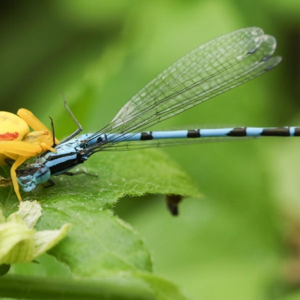 Alamy - ყვითელი კიბოსებრი ობობა (Misumena vatia) ევროპულ ცისფერ ნემსიყლაპიას (Enallagma cyathigerum) ჭამს.
