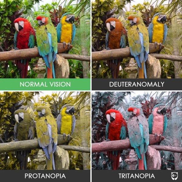 პოპულარული ვებგვერდი Bored Panda აქვეყნებს ფოტოებს, რომლებზე დალტონიზმის ხსენებული სამი ფორმაა წარმოდგენილი.