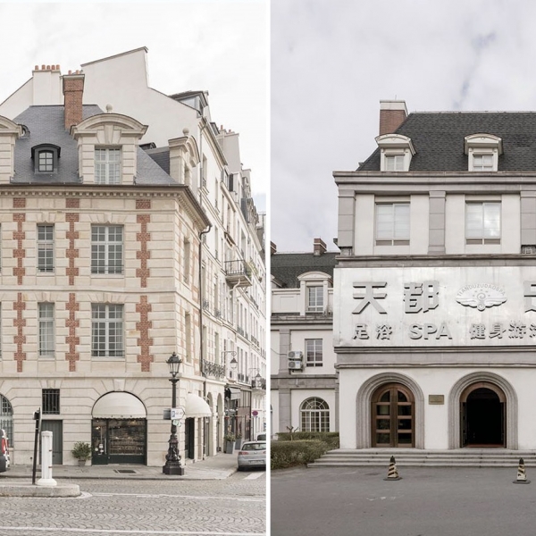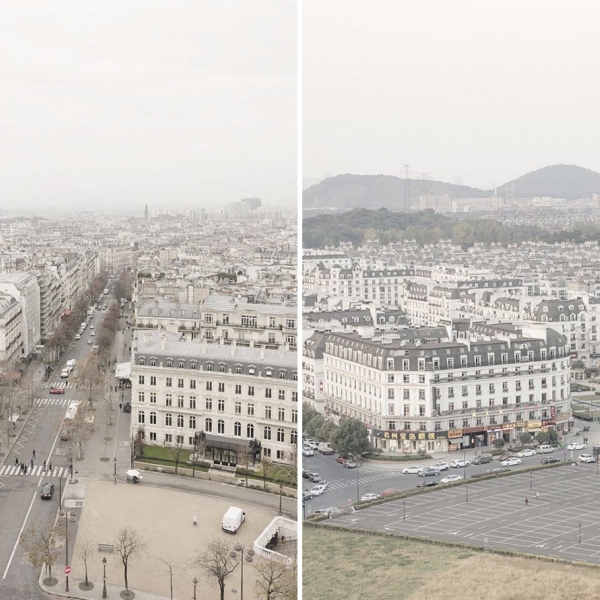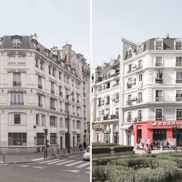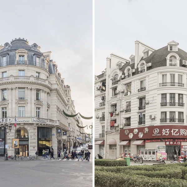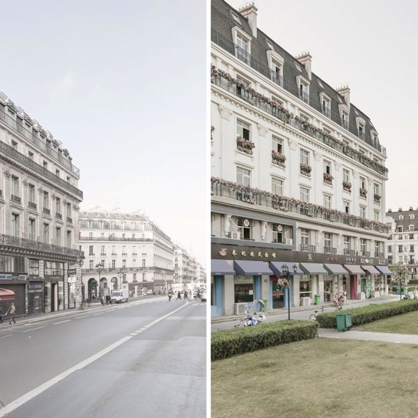 ფრანსუა პროსტის ფოტოებზე მარცხენა ნაწილში პარიზია, მარჯვნივ კი - ჩინეთის ქალაქის კადრები.