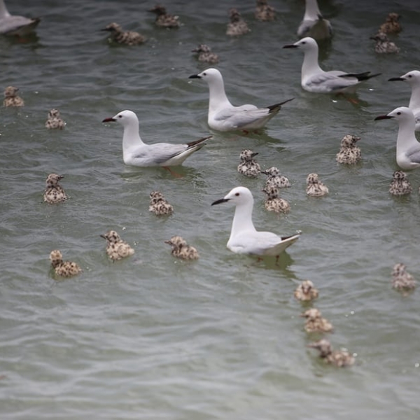 Anadolu - შავნისკარტა თოლიები (Chroicocephalus genei) და მათი ბარტყები სულაიმანიაში მდებარე კაშხალზე, ერაყი.