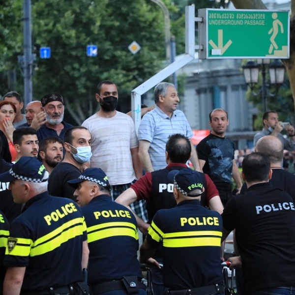პარალელურად, რუსთაველის გამზირზე აქციას მართავენ ძალადობრივი და ჰომოფობიური ჯგუფები. ისინი ქვებს, შუშის ბოთლებს და სხვადასხვა საგნებს ისვრიან, მუდმივად ცდილობენ პოლიციის კორდონის გარღვევას და მშვიდობიან აქციაზე შეჭრას. ჟურნალისტების ინფორმაციით, ძალადობრივი ჯგუფის წევრები პოლიციელებზეც ძალადობენ.