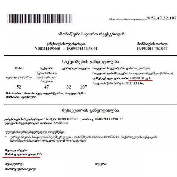 კერძოდ, 2014 წლის 18 აგვისტოს მარინე ღვინიაშვილმა იყიდა შირაქში, სოფელ ზემო მაჩხაანში („დიდნაური“) მდებარე 18 ჰექტარი სახნავი მიწა (საკადასტრო კოდი - 52.47.32.107), რაშიც 18 000 აშშ დოლარი გადაიხადა.
