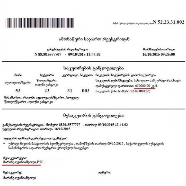 კახეთის ყოფილი გუბერნატორის მშობლების საკუთრებასა და მფლობელობაში სულ ირიცხება 2 974 061 კვ.მ, თითქმის 300 ჰექტარი სახნავი დანიშნულების მიწა.