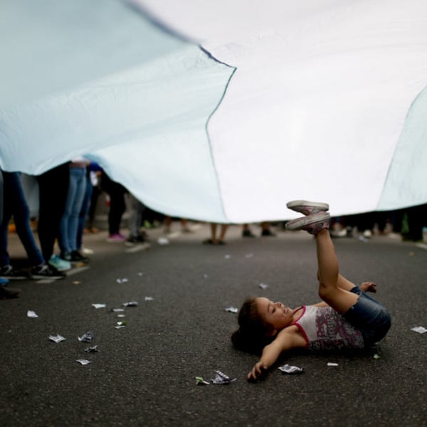 AP - ბუენოს აირესი, არგენტინა: გოგონა აქციაზე ქვეყნის ეროვნული დროშის ქვეშ კოტრიალობს.