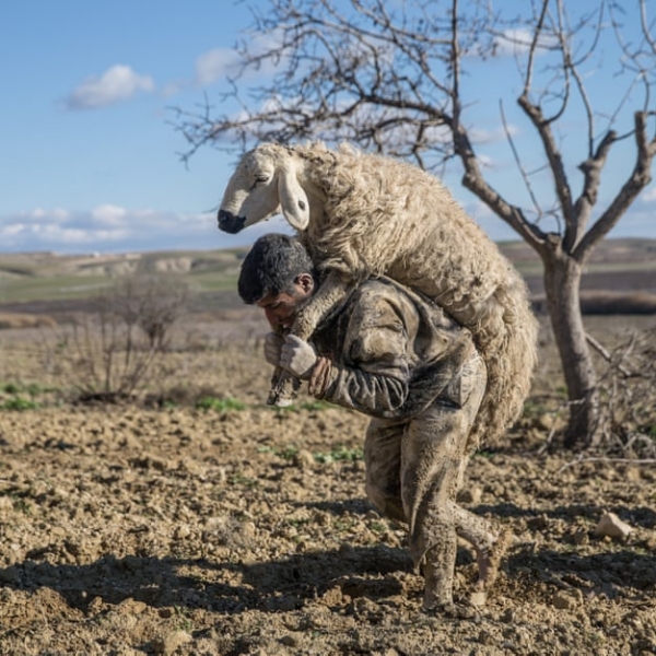 ჰალილ ფიდანი - შანლიურფა, თურქეთი: მამაკაცს ტალახში ჩავარდნილი ცხვარი ზურგით მიყავს.