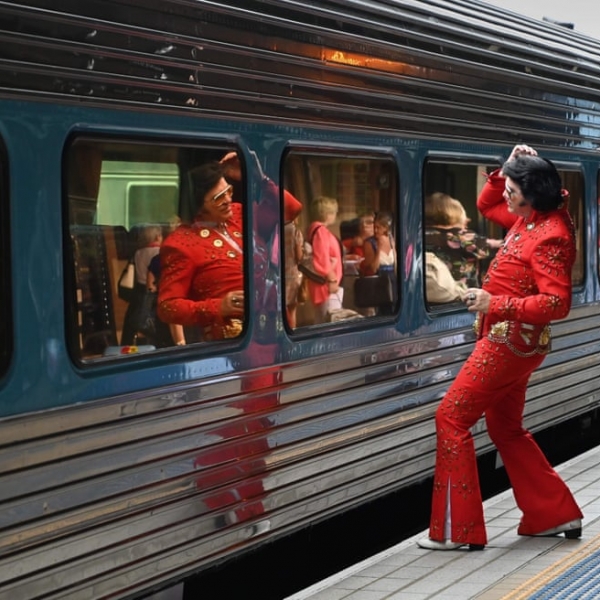 პიტერ პარკსი - სიდნეი, ავსტრალია: როკ-ენ-როლის მეფის მსგავს კოსტიუმში გამოწყობილი მამაკაცი ელვის პრესლის პროტოტიპების ფესტივალზე მიემგზავრება.