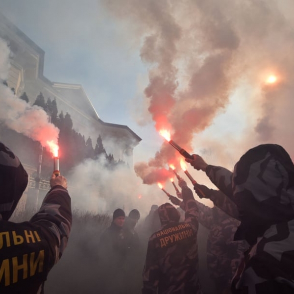 გენია სავილოვი - კიევი, უკრაინა: უკრაინული ულტრა-მემარჯვენე პარტია „ნაციონალნი კორპუსის“ აქტივისტები და მხარდამჭერები სავარაუდოდ სვინარჩუკების ოჯახის მფლობელობაში არსებულ სახლთან. პარტია ოჯახის ერთ-ერთი წარმომადგენელს ბრალს დებს რუსეთიდან სამხედრო აღჭურვი