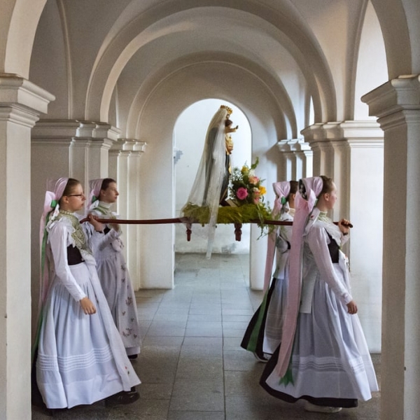 AP - როზენტალი, გერმანია: ტრადიციულ სამოსში გამოწყობილი სლავური უმცირესობის წარმომადგენელი ქალები ღვთისმშობლის ფიგურით სულთმოფენობის დღესასწაულის ცერემონიისას.