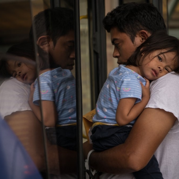 ლორენ ელიოტი - მაკალენი, ტეხასი: დაკავებისა და გაშვების შემდეგ ჰონდურასელი მიგრანტი ორი წლის შვილთან ერთად ავტობუსში ადის.