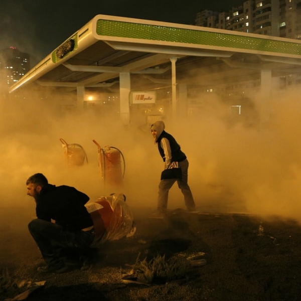 ეფრემ ლუკაცკი - კიევი, უკრაინა: გაზის კომპანია OKKO-ს საწინააღმდეგო დემონსტრაციაზე მონაწილეები ცეცხლსაქრობებს გაზგასამართ სადგურზე დგამენ.