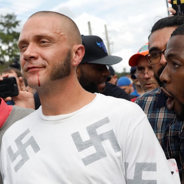 შენონ სტეპლტონი - გეინსვილი, ფლორიდა: შავკანიანი დემონსტრანტები ქუჩაში თეთრკანიან ნაციონალისტს უყვირიან.