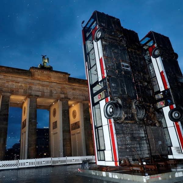 ფელიპე ტრუება - ბერლინი, გერმანია: სირიელი ხელოვანის, მანაფ ჰალბუნის არტ-ინსტალაცია ბრანდენბურგის კარიბჭის წინ, რომელიც სირიის ომისას აღმართულ ბარიკადებს ასახავს.