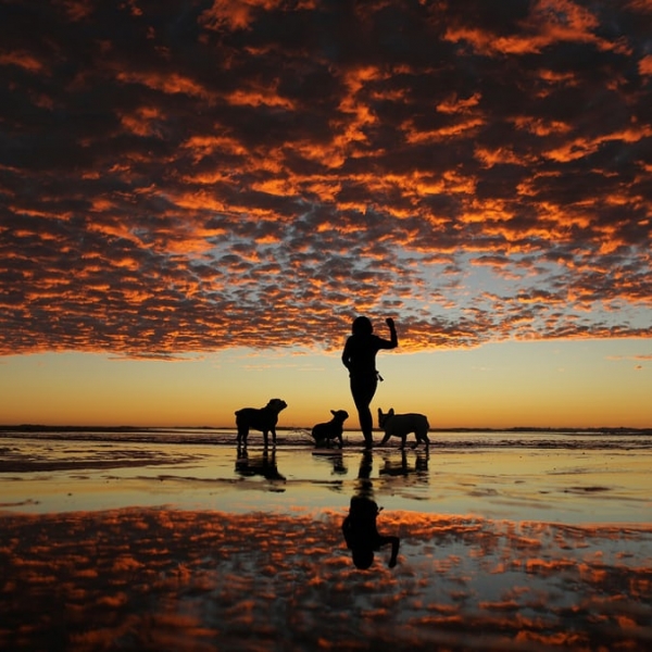 მაიკ ბლეიკი - დელ მარი, კალიფორნია: ქალი ძაღლებს ეთამაშება დაისის ფონზე.