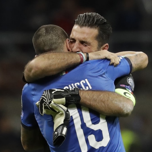 ლუკა ბრუნო - მილანი, იტალია: იტალიის ნაკრების კაპიტანი და მეკარე ჯანლუიჯი ბუფონი თანაგუნდელ ლეონარდო ბონუჩის ამხნევებს, მას შემდეგ რაც „სკვადრა აძურამ“ მსოფლიო ჩემპიონატის საგზური სენსაციურად დათმო შვედეთის ნაკრებთან.