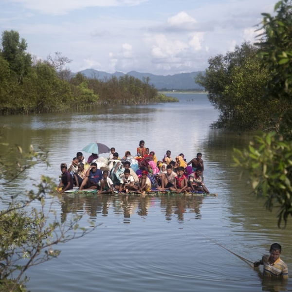 ა.მ. აჰადი - შაჰ პორირ დვიპი, ბანგლადეში: ბირმიდან ლტოლვილი როჰინჯიელი მუსლიმები პლასტმასის ჭურჭელისგან შეკრულ ტივით გადაადგილდებიან მდინარე ნაფზე.