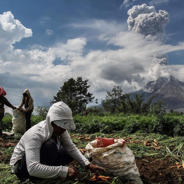 ივან დამანიკი - კარო, ინდონეზია: ფერმერები გამოღვიძებული ვულკანის, მთა სინაბუნგის ფონზე მუშაობენ.