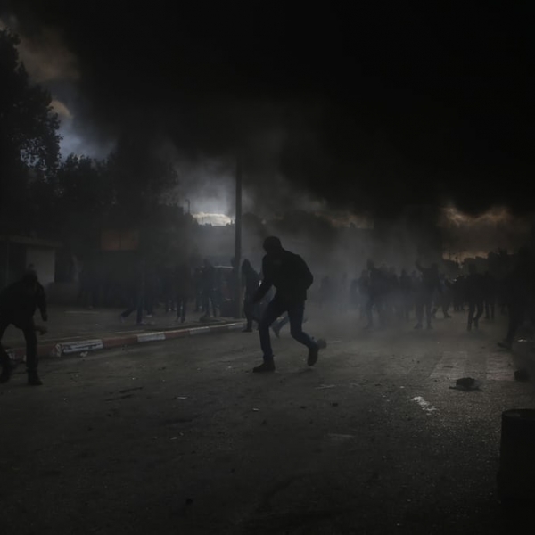 აბას მომანი - რამალა, პალესტინა: ადგილობრივი დემონსტრანტები ისრაელის პოლიციის სპეცრაზმელებთან შეტაკებისას დამწვარი საბურავების შავი კვამლის ფონზე.