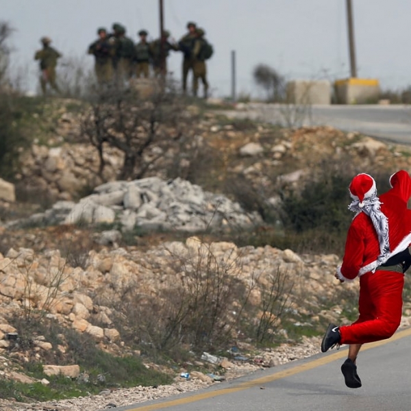 მოჰამად თოროქმანი - რამალა, პალესტინა: სანტა კლაუსის კოსტიუმში გამოწყობილი დემონსტრანტი ქვას ისრაელის სპეცრაზმელებს ესვრის.