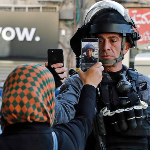 აჰმად ღარაბლი - იერუსალიმი, ისრაელი: პალესტინელი ქალი და ისრაელის პოლიციის სპეცრაზმელი ერთმანეთს ფოტოს უღებენ.