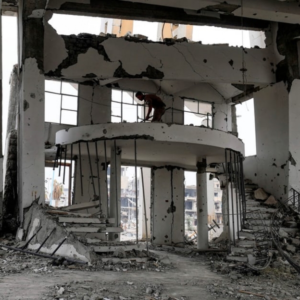 დელილ სულეიმანი - რაქა, სირია: ნაღმის დეტექტორით აღჭურვილი სპეციალისტი დანგრეულ შენობაში ასაფეთქებლის ძებნისას.