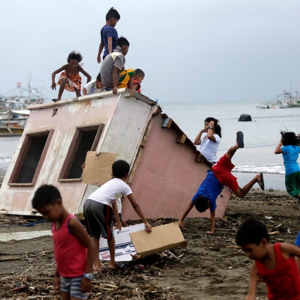 ფრენსის მალასიგი - ინფანტა, ფილიპინები: სამაშველო ოპერაციის ფონზე ბავშვები ძველი ნავის ნარჩენზე თამაშობენ.