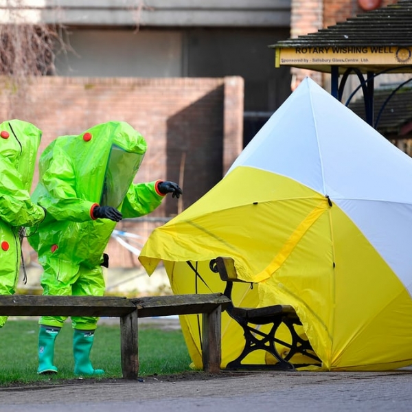 ბენ სტენსოლი - სოლზბერი, ინგლისი: სასწრაფო დახმარებისა და უსაფრთხოების სამსახურის წევრები ქიმიური იარაღით მოწამლული ადამიანების ადგილთან, სადაც ცნობილი ვერსიით, რუსი ორმაგი აგენტი სერგეი სკრიპალი მოწამლეს.