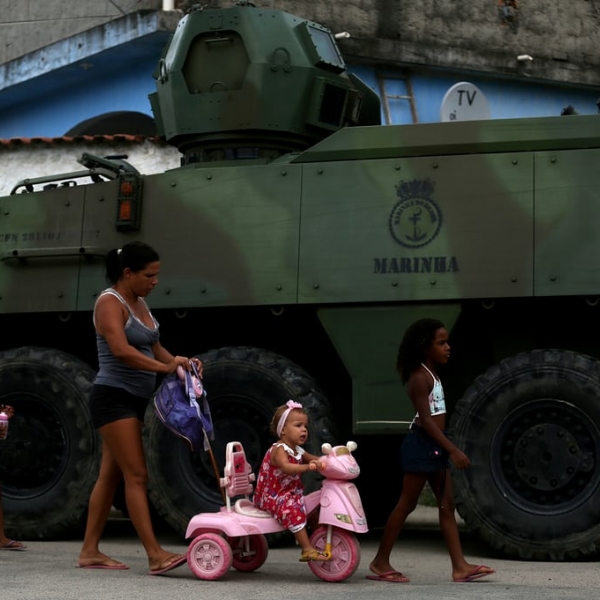 პილარ ოლივარესი - რიო დე ჟანეირო, ბრაზილია: ვილა კენედის გარეუბანში ნარკოდილერების წინააღმდეგ ჩატარებული სპეცოპერაციის შემდეგ ადამიანები ჯავშანტექნიკას გვერდს უვლიან.