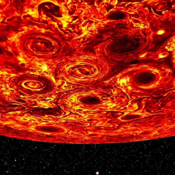 NASA - იუპიტერი: ცენტრალური ციკლონი პლანეტის ჩრდილო პოლუსზე.