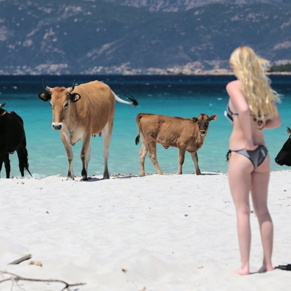 პასკალ პოშარ-კასაბიანკა - კორსიკა, საფრანგეთი: ქალი მარ-ე-სოლის სანაპიროზე მოსიარულე მსხვილფეხა საქონელს უცქერს.