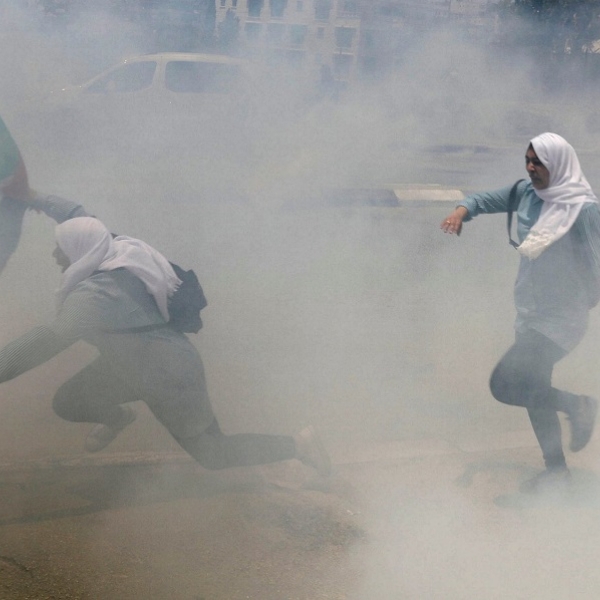 ამარ ავადი - ბეთლემი, პალესტინა/დასავლეთ სანაპირო: პალესტინელი სკოლის მოსწავლე გოგონები ცრემლსადენ გაზს გაურბიან, რომელიც ისრაელის სპეცრაზმმა ნაქბას (პალესტინელთა გამოსახლება ისრაელიდან 1948 წელს) 69-ე წლისთავთან დაკავშირებულ დემონსტრაციაზე გამოიყენა.