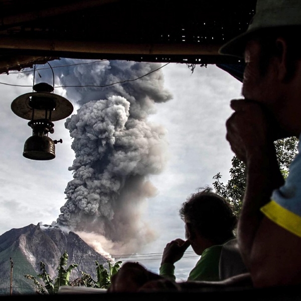 ივან დამანიკი - კარო, ინდონეზია: სოფლის მაცხოვრებლები ვულკანურ მთა სინაბუნგიდან ფერფლის ამოფრქვევას თვალს ადევნებენ.