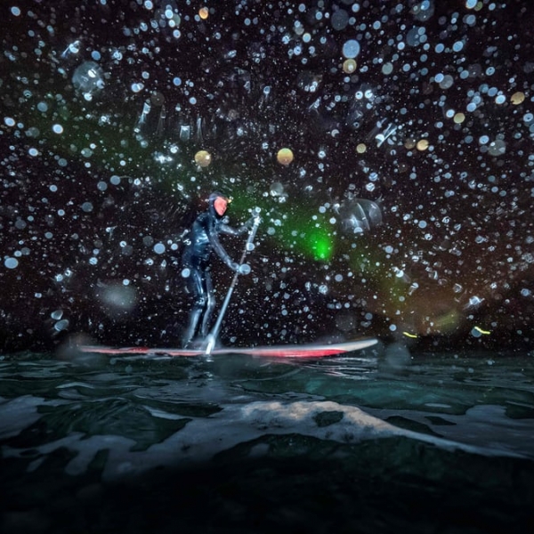ოლივიე მორინი - უნსტადი, ნორვეგია: ფრანგი ნაოსანი სპორტსმენი ლოფოტენის კუნძულთან ჩრდილოეთის ციალის ფონზე.