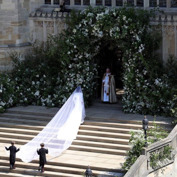 მეგან მარკლს ფრანგული მოდის სახლ Givenchy-ის პირველი ბრიტანელი კრეატიული დირექტორის, კლერ უეიტის მიერ შექმნილი კაბა ეცვა. ხუთმეტრიან ფატას თავზე 1932 წელს დამზადებული ბრილიანტებიანი გვირგვინი უმაგრებდა. პატარძალი საკურთხეველთან უელსის პრინცმა ჩარლზმა მიიყვანა, რადგან მსახიობის მამამ, ავადმყოფობის გამო, ქორწილში მისვლა ვერ შეძლო. ღონისძიებას მეგან მარკლის დედა ესწრებოდა.