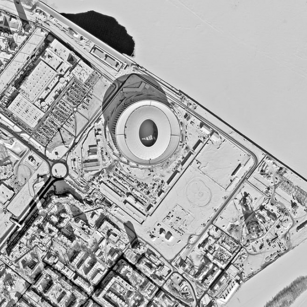 Роскосмос - ნიჟნი ნოვგოროდი, რუსეთი: კოსმოსიდან გადაღებული შავ-თეთრი ფოტო, სადაც ჩანს მსოფლიო ჩემპიონატის მასპინძელი ქალაქის სტადიონი.