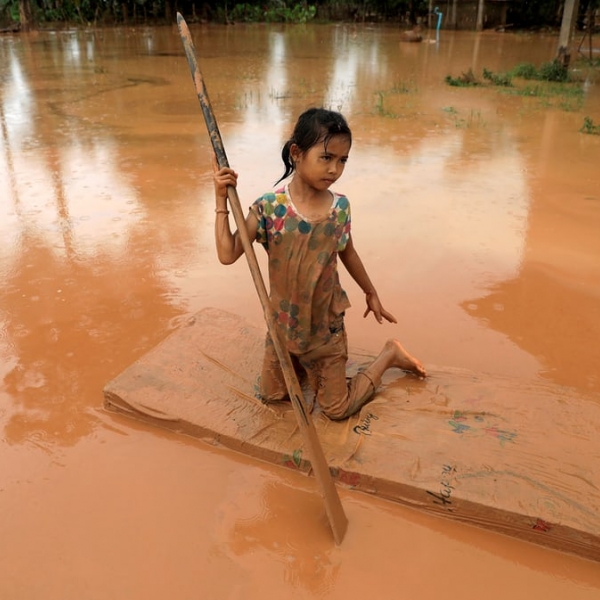 სოე ზეია ტუნი - ატაპეუ, ლაოსი: გოგონა საწოლის მატრასს ნავად იყენებს ჰესის მიერ გამოწვეული წყალდიდობისას.