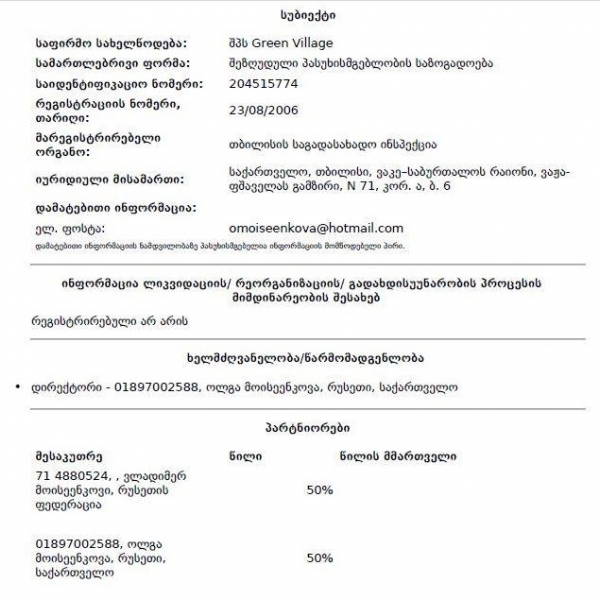 ოფიციალური მონაცემებით, შპს „Green Village“-ს (ს/კ - 204515774) მესაკუთრეები 2012 წლის 8 ივნისიდან არიან რუსეთის ფედერაციის მოქალაქეები - ოლგა მოისეენკოვა (50 %-ის მფლობელი და დირექტორი) და მისი მამა - ვლადიმერ მოისეენკოვი (50 %).
