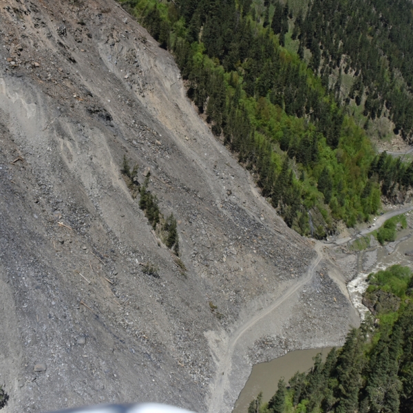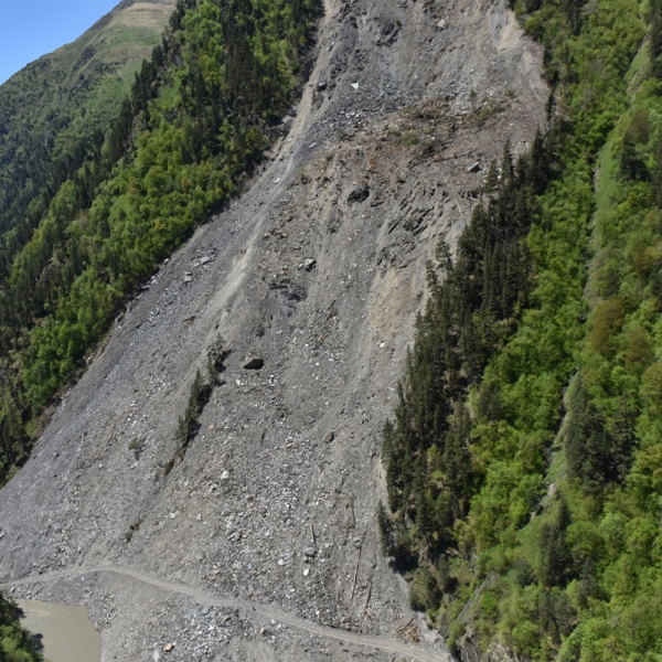 - ბატონო გიორგი, ფოტოებიდან, რომელიც „მთის ამბების“ ფოტორეპორტიორმა შვეულმფრენიდან გადაიღო, ჩანს, რომ მოწყვეტილ მთაზე ლოდები ყრია, მთის წვერზე კი ტყის ნაწილი მოწყვეტილია და შუაშია გაჩერებული. ხელოვნური ყრილებით გზა ძირში რომ გაგყავთ, ისედაც სახითაფო გზაზე, მდგომარეობა უფრო საშიში არ გახდება?