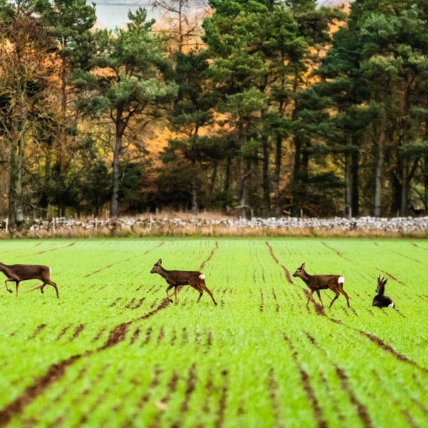 ქრის ტრიკლენდი - ევროპული შველის (Capreolus capreolus) ოჯახი სმეილჰოლმის ფერმებთან ახლოს, კელსო, შოტლანდია.