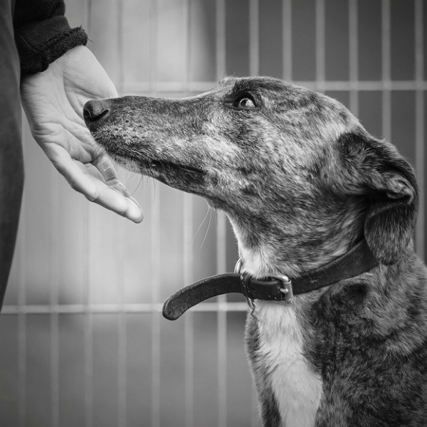 კატეგორია „მაშველი ძაღლის“ გამარჯვებული: ალექსანდრა რობინსი - ძაღლი სახელად ქლოე მომვლელის ხელს ყნოსავს.