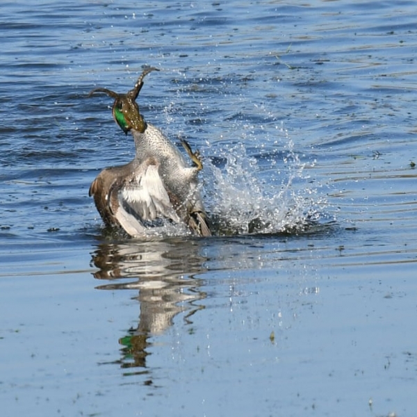 გერლინდე ბაიერი - ბაყაყი იხვისგან თავის დარწევას ცდილობს, ფრანკფურტი, გერმანია.