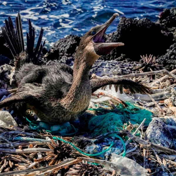 როდრიგო ბუენდია - ფრენის უნარწართმეული ჩვამა ბუდეში, რომელიც ნარჩენებითაა სავსე, კუნძული ისაბელა, გალაპაგოსის არქიპელაგი.