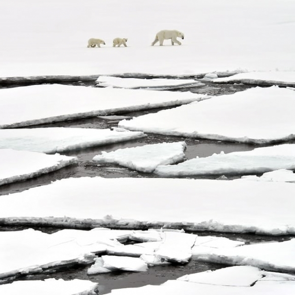 ლევ ფედოსეევი - პოლარული დათვი ორ ბელთან ერთად არქტიკის სანაპიროზე.