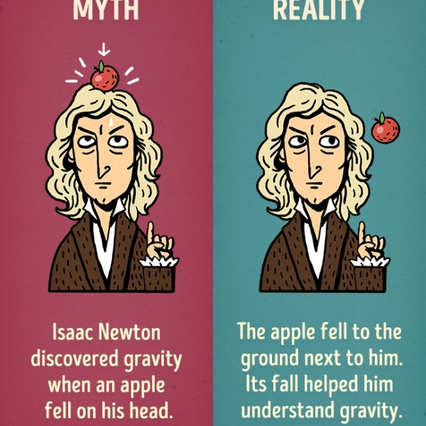 ისააკ ნიუტონს თავზე ვაშლი დაეცა და მიზიდულობის კანონი აღმოაჩინა - სინამდვილეში ვაშლი მის გვერდით დაეცა, რაზე დაკვირვებაც მას აღმოჩენაში დაეხმარა.