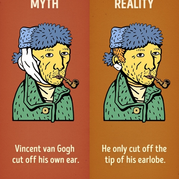 ვინსენტ ვან გოგმა ყური მოიჭრა - სინამდვილეში მხატვარმა მხოლოდ ყურის ბიბილო მოიჭრა.