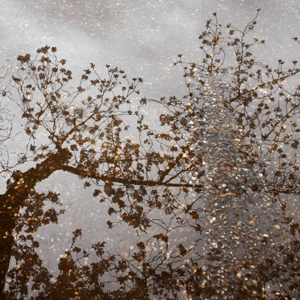 ჟაკლინ მარტინი - ბეღურა ვაშინგტონის ქუჩაში არსებულ გუბურაში, რომელშიც გაყვავებული ალუბალი ირეკლება.