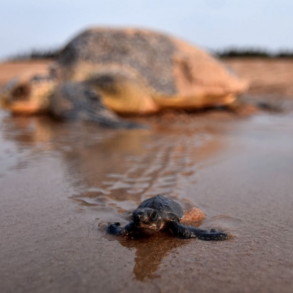 ასიტ კუმარი - რიდლის კუს (Lepidochelys olivacea) ნაშიერი აღმოსავლეთ ინდოეთის სანაპიროზე.